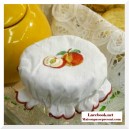 Cache pot à confiture brodé main. Motif " pommes" Matière coton, doublure interieure plastifiée. Contour élastique. Diamétre couvercle pot entre 8.5 et 10 cm maxi.