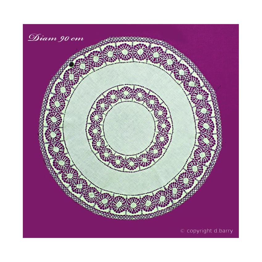 Nappe de table en toile de coton et dentelle au fuseau fait main, coloris blanc cassé , diam: 90 cm ref: Augusta n°7