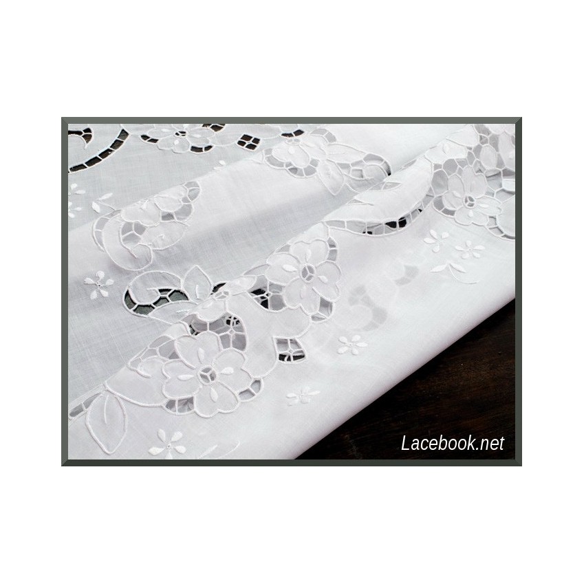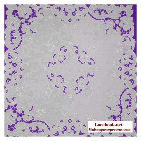 surnappe toile de coton blanc...broderie richelieu agrementée de motifs fleurs art deco. Dim: 80 x 80 cm