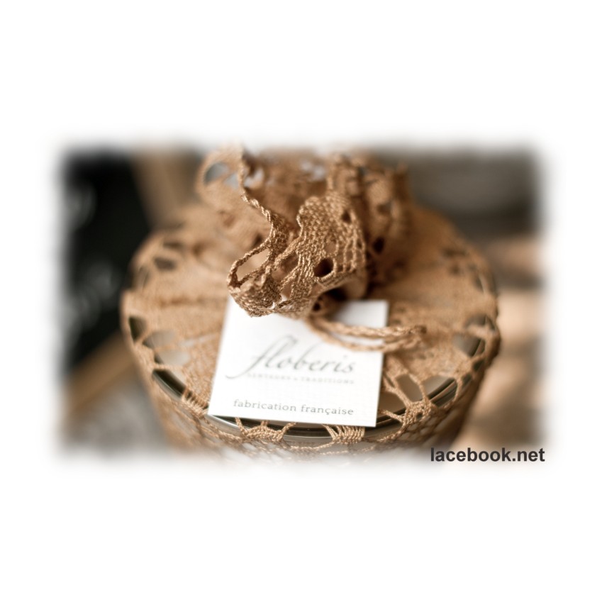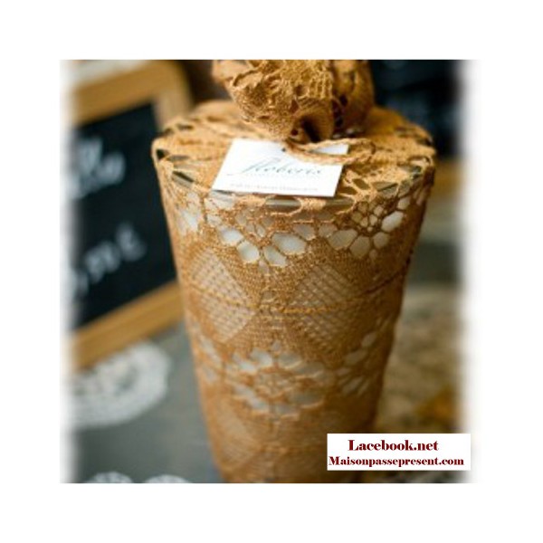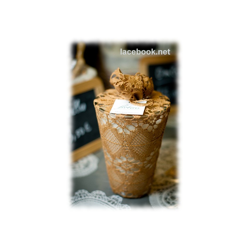 cire de soja 100 % naturelle. Méche en coton sans plomb, verre traditionnel recouvert de dentelle de lin ou d'un carton retenu par un lacet noué à la main.