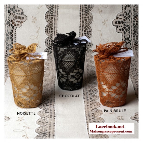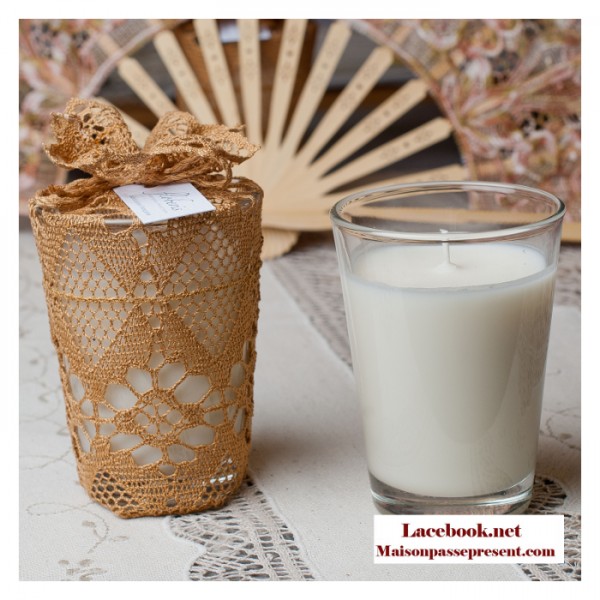 Inscrivez-vouscire de soja 100 % naturelle. Méche en coton sans plomb, verre traditionnel recouvert de dentelle de lin ou d'un carton retenu par un lacet noué à la main.